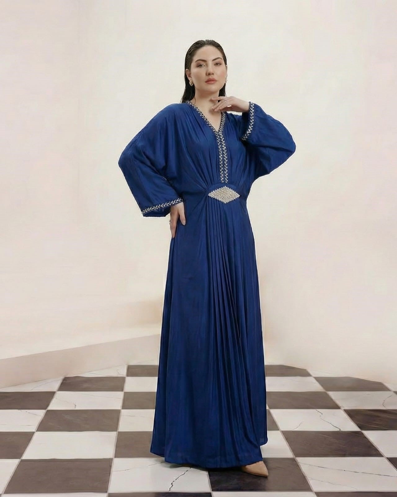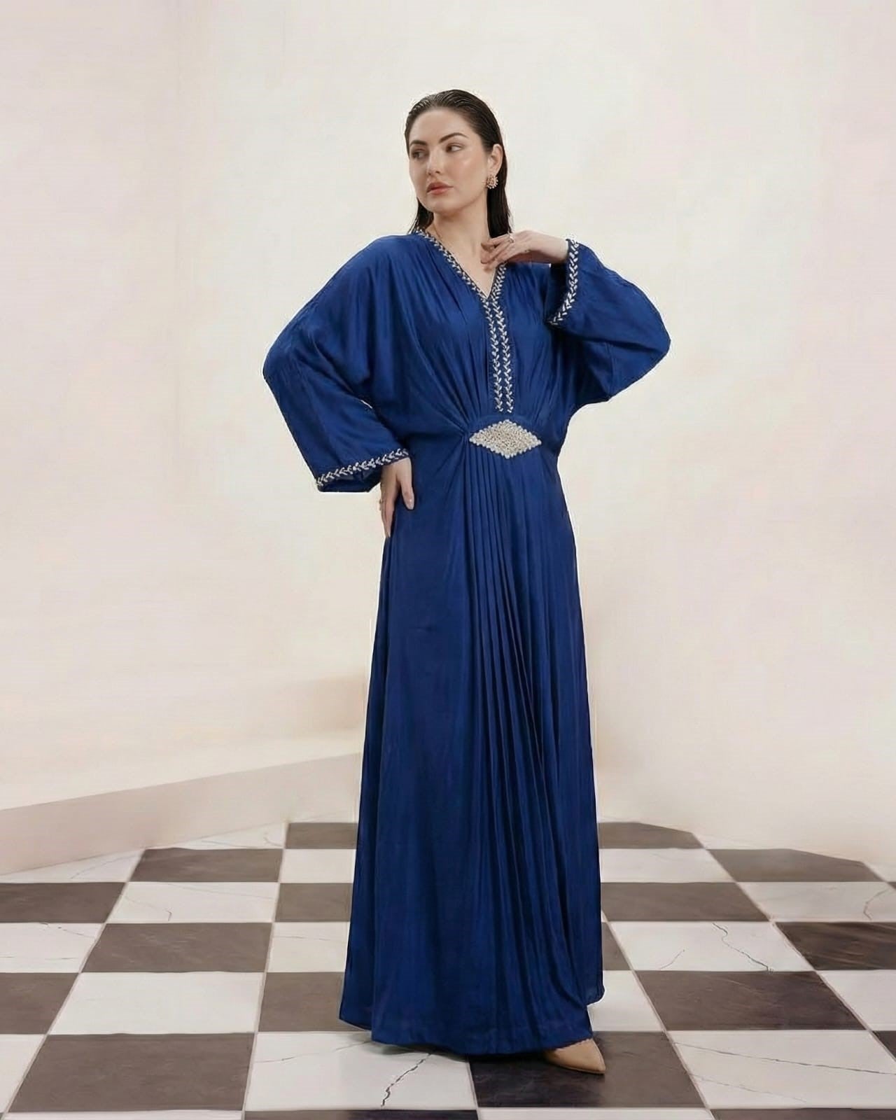 The silhouette boasts generous, fluid sleeves and falls into a graceful full length. The defining feature is the central embellishment: a breathtaking, crystal-encrusted Brooch/Waist Detail that cinches the fabric at the waist, creating striking vertical pleats that cascade dramatically down the body. Further refinement is added by the delicate silver Tiki Stone or crystal embroidery tracing the plunging V-neckline and finishing the cuffs of the sleeves in a sophisticated leaf motif. Neelam is the epitome of effortless glamour, designed for the Zafinah woman who seeks commanding sophistication with a regal flair, requiring no further accessorizing.