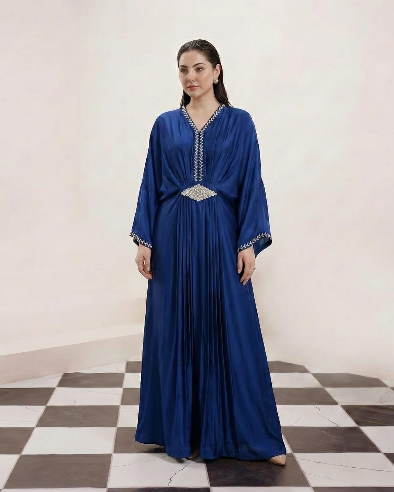 The Neelam Kaftan is a majestic statement piece, capturing the intense, royal hue of a sapphire in flowing Royal Blue Sheesha Silk. This kaftan redefines dramatic elegance through its luxurious volume and strategic embellishment.