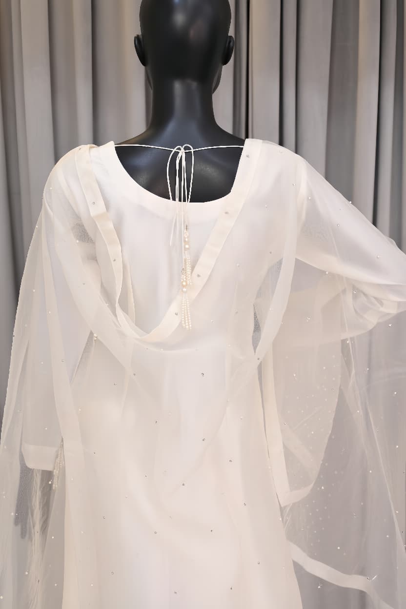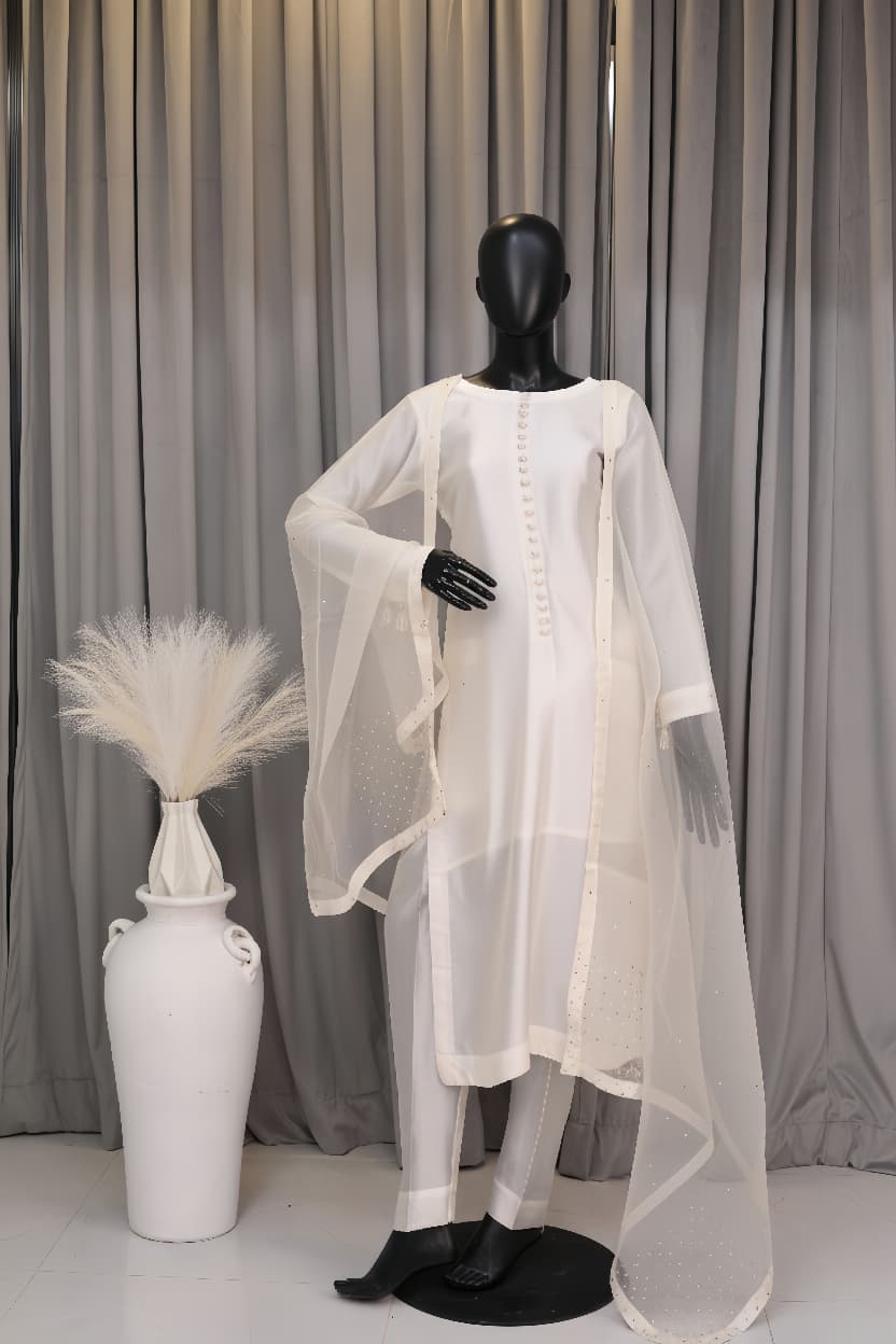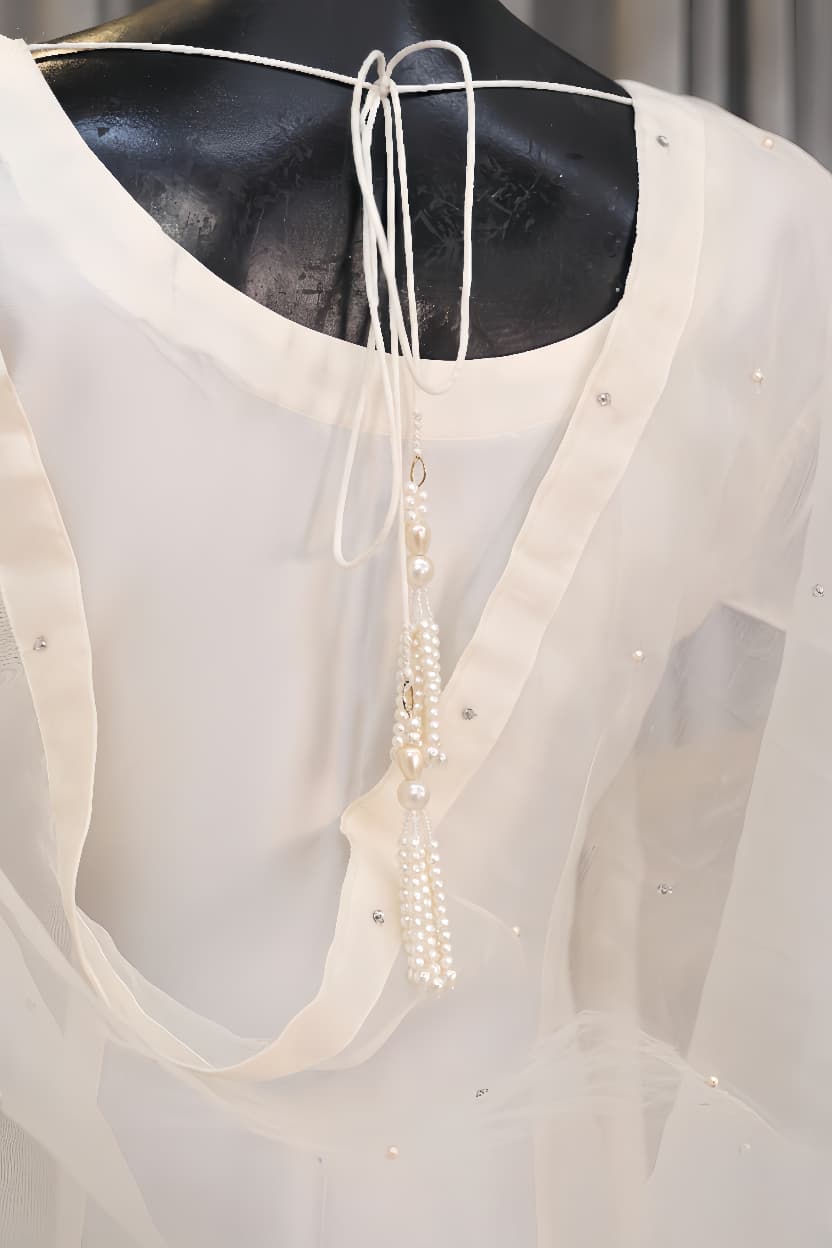 The full-sleeved kurta features a clean, round neckline and is accented by a column of exquisite Fabric Buttons running down the front. The subtle structure of the silk is contrasted by the accompanying Dupatta, a sheer masterpiece embellished with delicate Pearls and Tiki Stones scattered like stars across its surface. The border of the dupatta is further elevated with precise Aari Work, a hallmark of fine South Asian craftsmanship. The back of the kurta is secured with an elegant Back Dori, finished with handcrafted Pearl Tassels, offering a final, captivating flourish. Paired with perfectly tailored trousers, Selene is designed for a grand entrance, embodying lightness and sheer, effortless luxury.