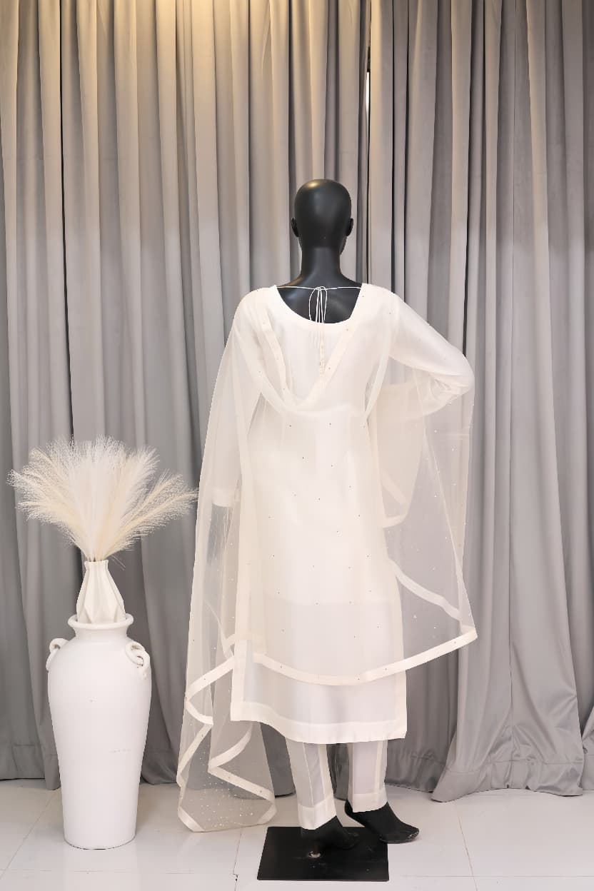 Fabric: Luxurious Sheesha Silk for the kurta and trousers, with a sheer organza dupatta