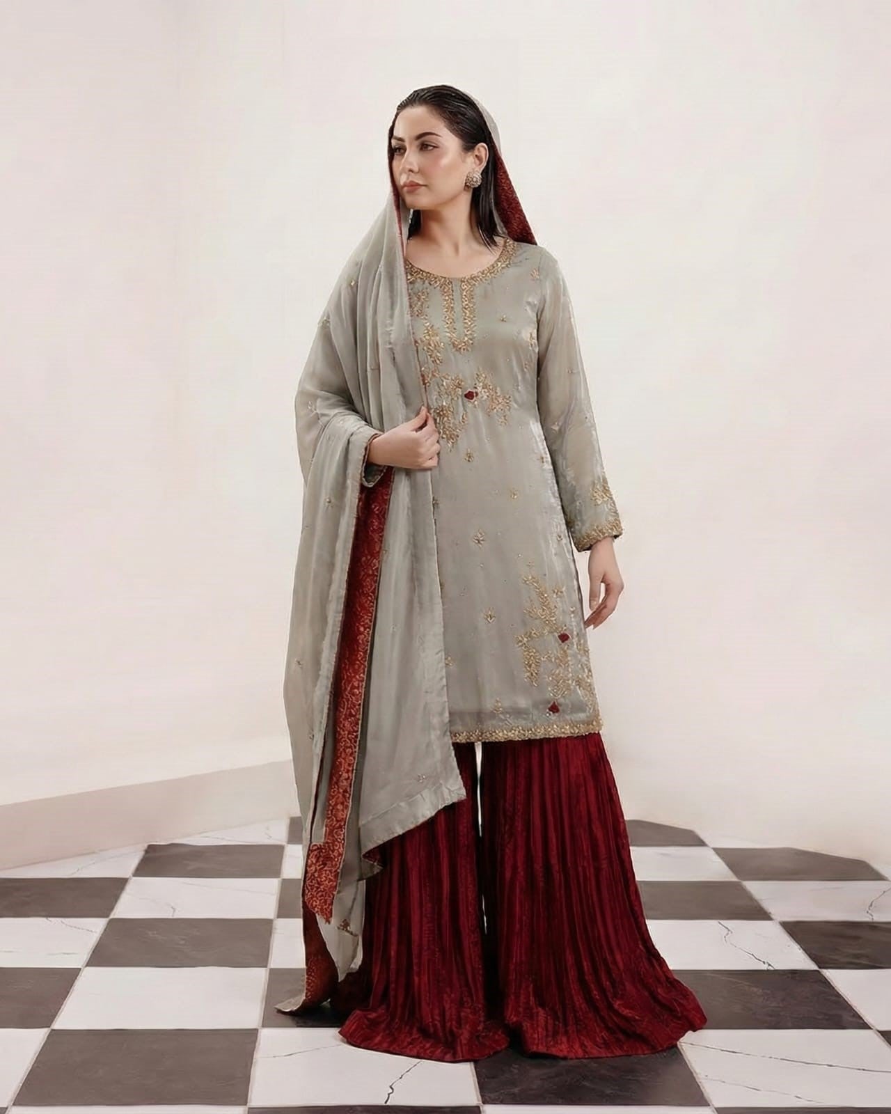 Exquisite golden threads, beads, and sequins are meticulously applied in detailed floral and vine motifs, creating a sense of natural opulence that cascades across the front of the shirt. This artistry is punctuated by bold Burgundy accents, providing a stunning contrast and depth. The kurta is dramatically paired with a voluminous Pleated Sharara in a deep, textured burgundy fabric, lending striking movement and traditional flair. A subtle metallic brocade border frames the contrasting burgundy border of the matching dupatta, tying the entire ensemble together with unmatched festive elegance. Zarveen is a statement of heritage redefined, designed to ensure an unforgettable presence.